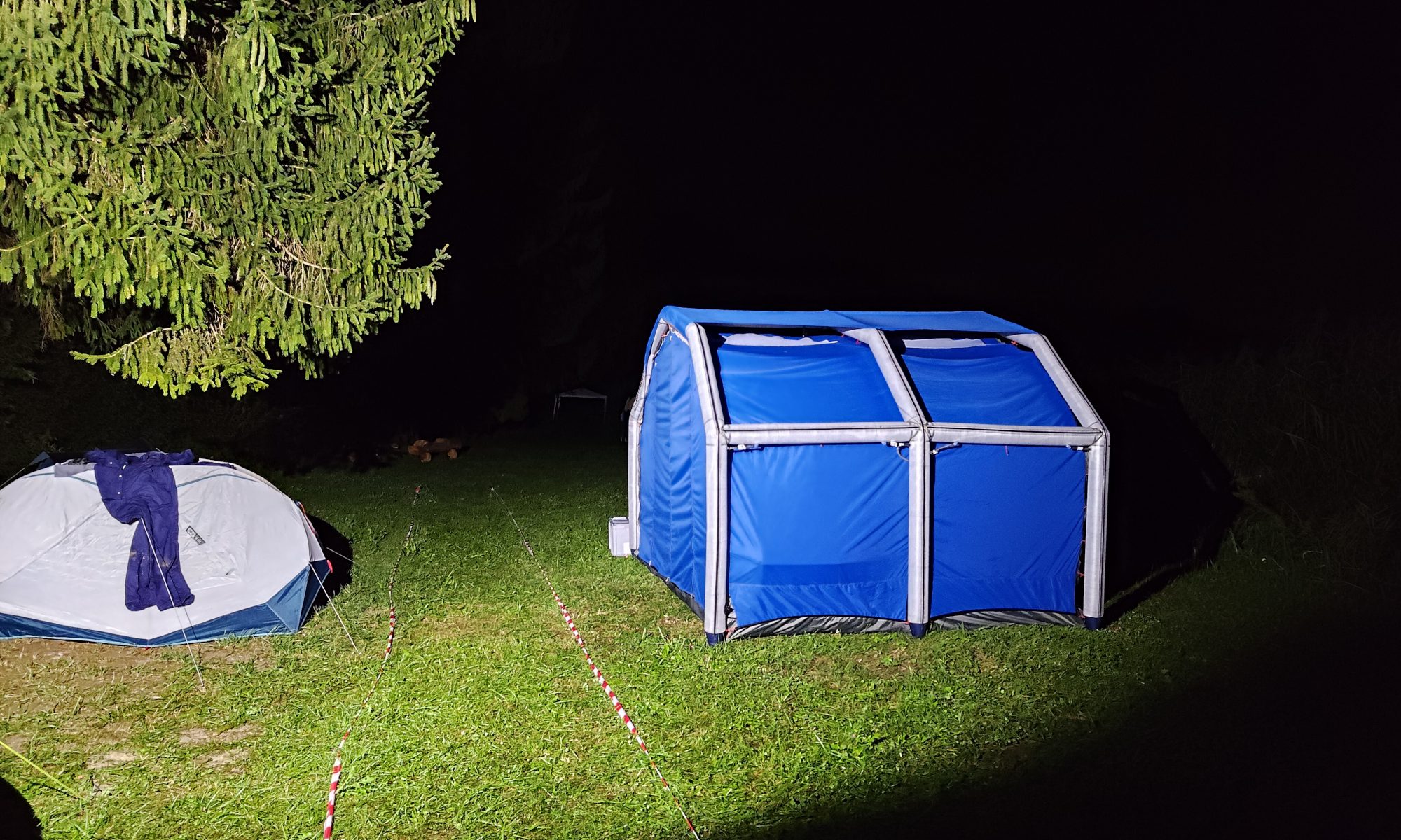 Een tent kan met een compressor opgeblazen worden maar ook met een handpomp. Dit kan in zo’n 4 minuten.
